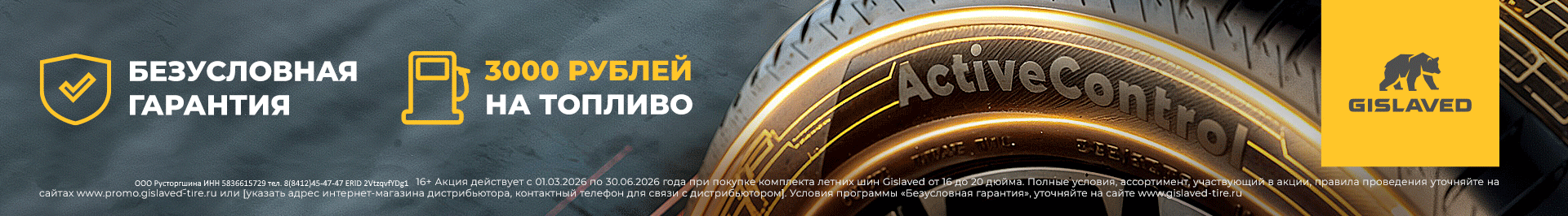 • Купите комплект из 4х летних шин Gislaved акционных моделей (16-20 дюйма) одного типоразмера и суббренда: GISLAVED ActiveControl, GISLAVED EcoControl, GISLAVED PremiumControl, GISLAVED TerraControl, GISLAVED TerraControl ATR, GISLAVED UltraControl.